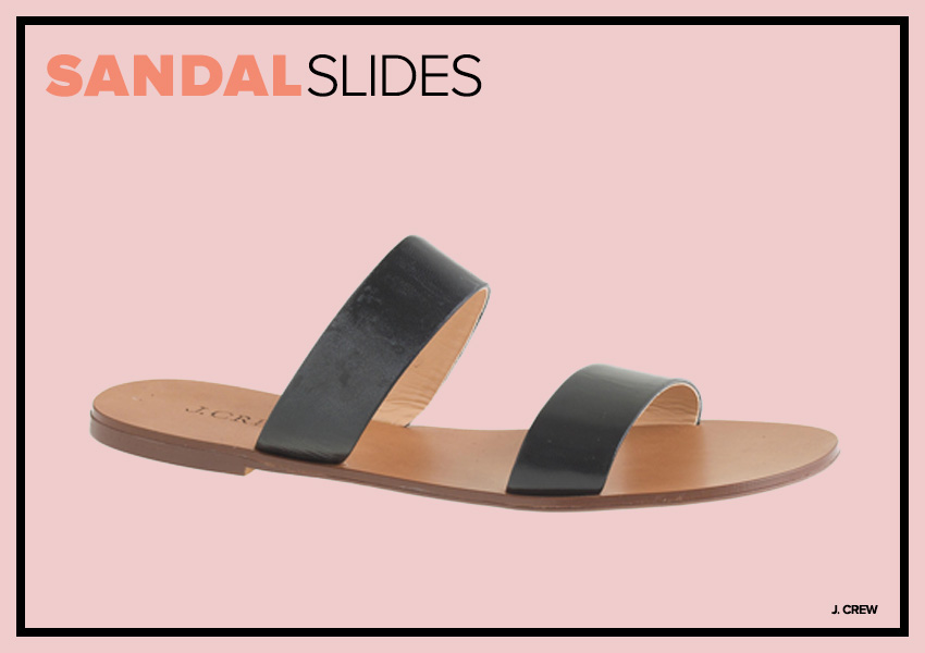 This season’s flip flop. The slider sandal has no uncomfortable piece of rubber in between your toe, instead you simply slide on and go. You can find this shoe trend in many stores and all over the internet. From simple rubber and black to more glamorous leather and metallics, you are sure to see a wide range of these shoes worn around during the summer.